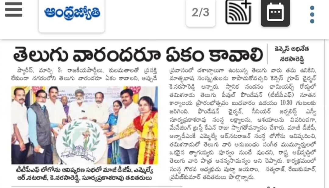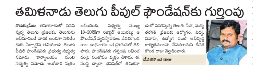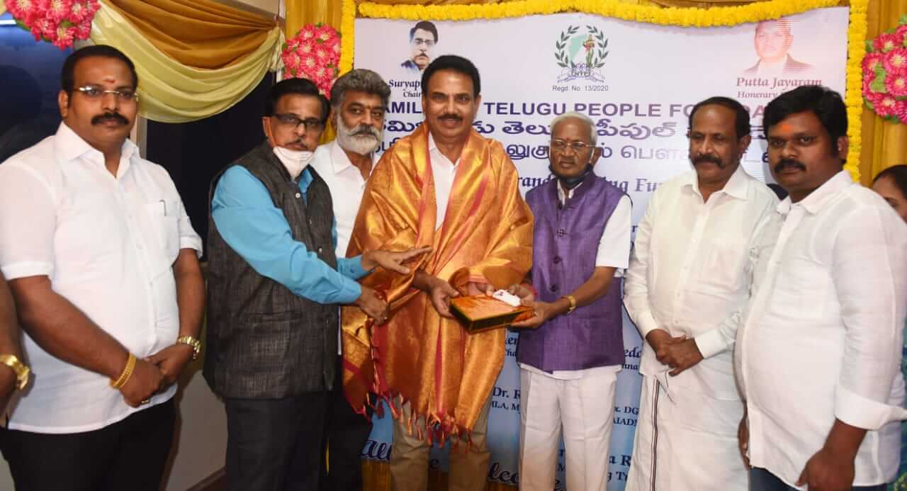 Tamil Nadu Telugu People’s Foundation (TNTPF) is a voluntary service organization formed in Tamil Nadu to work for the welfare of Telugu people living in Tamil Nadu. As part of the State Reorganization Act, 1956, news States are formed on linguistic basis. Thus Andhra Pradesh is formed by dividing some districts part from Madras State and including Hyderabad and Telangana districts. Telugu people who are settled in different parts of Tamil Nadu are not inclined to shift from Tamil Nadu to Andhra Pradesh then. According to an estimation, about 2 crore Telugu people are still living in Tamil Nadu out of a total of 7.5 crore population of the State. Various Telugu cultural organizations used to organize programmes to safeguard the interests of Telugu pride. Interestingly, Tamil Nadu is the highest Telugu-speaking population after two Telugu States.